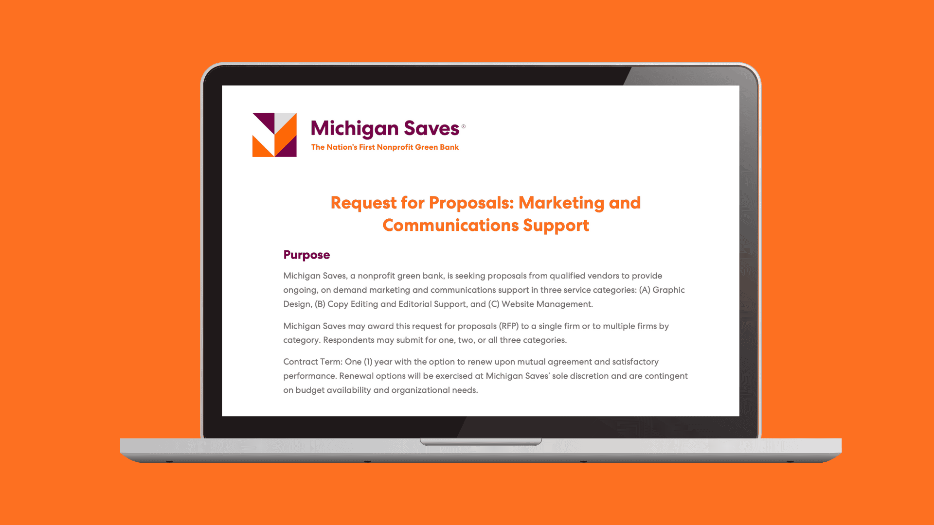 Michigan Saves, a nonprofit green bank, is seeking proposals from qualified vendors to provide ongoing, on demand marketing and communications support in three service categories: (A) Graphic Design, (B) Copy Editing and Editorial Support, and (C) Website Management. Michigan Saves may award this request for proposals (RFP) to a single firm or to multiple firms by category. Respondents may submit for one, two, or all three categories. Contract Term: One (1) year with the option to renew upon mutual agreement and satisfactory performance. Renewal options will be exercised at Michigan Saves’ sole discretion and are contingent on budget availability and organizational needs. Please submit responses by 5:00 PM EDT on October 2, 2025.